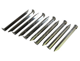 These pegs nearly always come in yellow, and they are made from a rigid plastic. Because they are thicker they have a lot of  grip on the ground and are ideal for soft muddy ground. They are also the peg to use on sand or sandy ground so if you are pitching a windbreak on a beach and need to add guy ropes to the windbreak, these are the ones you'll need. In soil you will need a mallet but in sand you can probably push them in. They are cheap at about £3 for a pack of 6.