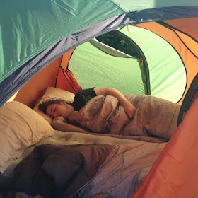 We had brought a Vango Halo tent which is a tent popular with bikers and backpackers because of it's small and lightweight pack size. It was the first time we pitched it and there was a little bit of scratching of heads as it is a geodesic tent (i.e. crossing poles) with an inner you have to attach from the inside. I have left the inner attached now and will probably not detach it again unless I really have to. The inner tent is orange and the fly is green and this tent is unique in that it has doors which are designed to be opened within one arm movement in an arc. There are one of these doors on each side so two people get their own door and this also aids cross ventilation for when the sun beats down and heats it up inside. It is also tall enough to sit up in cross legged and there is storage space for boots and bags etc outside the inner but under the protection of the fly sheet. I was seriously impressed how roomy it was inside.