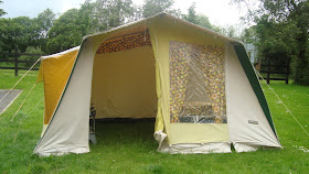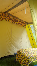 The canvas is very well faded, but as least it's evenly faded all over. The top is still quite brown inside but it's cream from the outside. And the bright, lime green on the inside walls is pale green on the outside, hardly discernible from the cream colour. The curtains are brown, orange and lime green flowers, in these pictures I'm using one set of the curtains as a table cover. The children and I had our Sunday Lunch in the tent, and my Mum and Dad came to visit the tent later on in the afternoon.