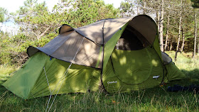 The tent was very easy to put up. This tent has a separate groundsheet which you peg down first, then you use the pegs already placed to tie down the tent. I reckon it was pitched in two or three minutes at the most. It is actually easier not to have the ground sheet sewn in because it means when it's put away again it's easy to shake the sand or dirt off the groundsheet rather than having it trapped inside.